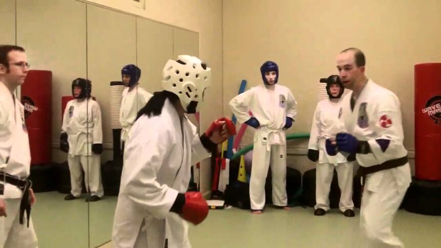 Here, Kat Lau of Zen Martial Arts survives the kumite portion of her Isshinryu brown-belt test.