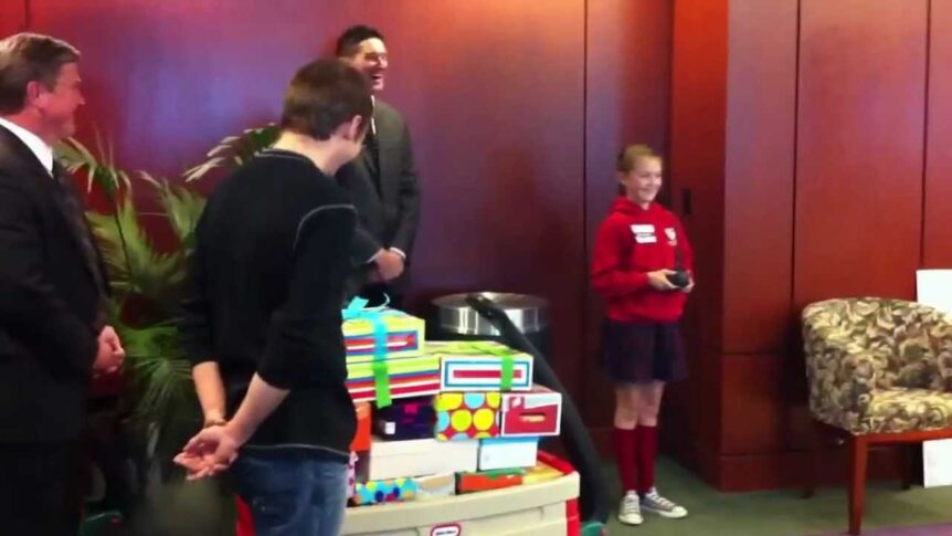 As part of Grace’s green-belt test at Zen Martial Arts, she choose to to help kids at Shriner’s Children Hospital in Sacramento. Here, Grace delivers 40 “waiting room kits” that she made with help from the community and explains to the hospital board of governors why she did this fine work.