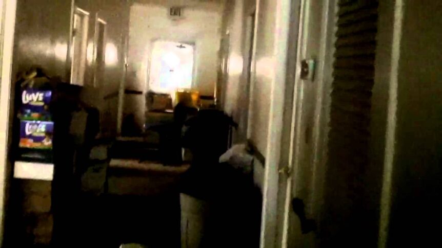 Chris Hadlock and Mike Oliver search through scrap material for a very creative wall building project during a restoration project at a day care in Greensboro, Alabama. This is the kind of work that we do every year.